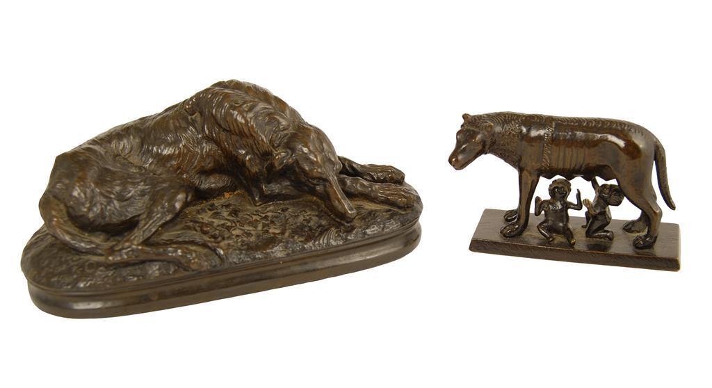 A bronze model of the Capitoline Wolf, with Romulus and Remus, 2in (5cm) h, and a model of a recumbent wolfhound. (2)