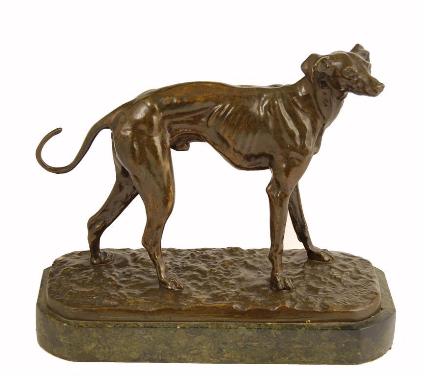 After Pierre Jules-Mene (1810-1879). A greyhound, bronze, signed, 8.75in (22cm) h, 11in (28cm) l, on a marble plinth.