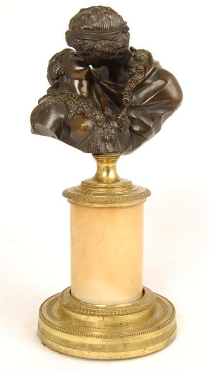 After Jean-Antoine Houdon (1741-1828). A 19th century bronze 'The Kiss', on a marble pedestal with gilt metal mounts, 10in (25.5cm) h.