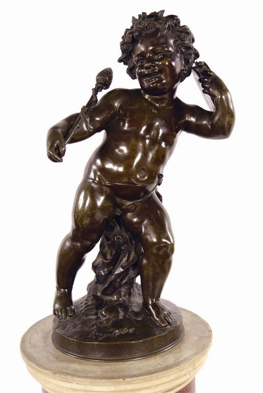Benedict Rougelet (1834-1894). A bronze figure of a dancing putto holding a tambourine and a staff, the base signed 'Rougelet', the underside with a later bracket inscribed 'L'age d'Or' and 'E B', 22.5in (57cm) h.