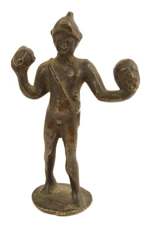 A bronze figure, of a Roman warrior holding two heads, the base incised a monogram 'HB,' 3.75in (9.5cm) h.