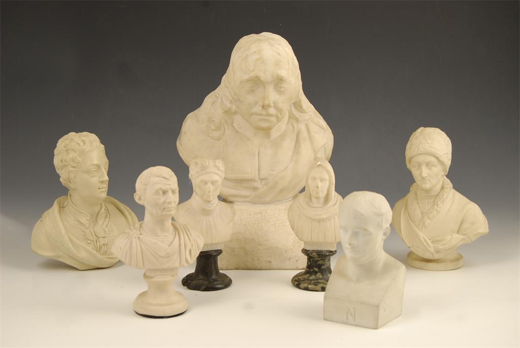 A marble bust of a 17th century gentleman, 11in (28cm) h, and six other busts including; Rousseau, Addison, Dante, Napoleon, in ceramic, alabaster and resin. (7)