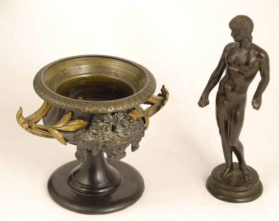 After the antique, Narcissus standing on a circular base, bronze, 19th century, 9in (23cm) h, and a bronze urn with gilt lifts and a later polished slate stem and base, 5.75in (14.5cm) h. (2)
