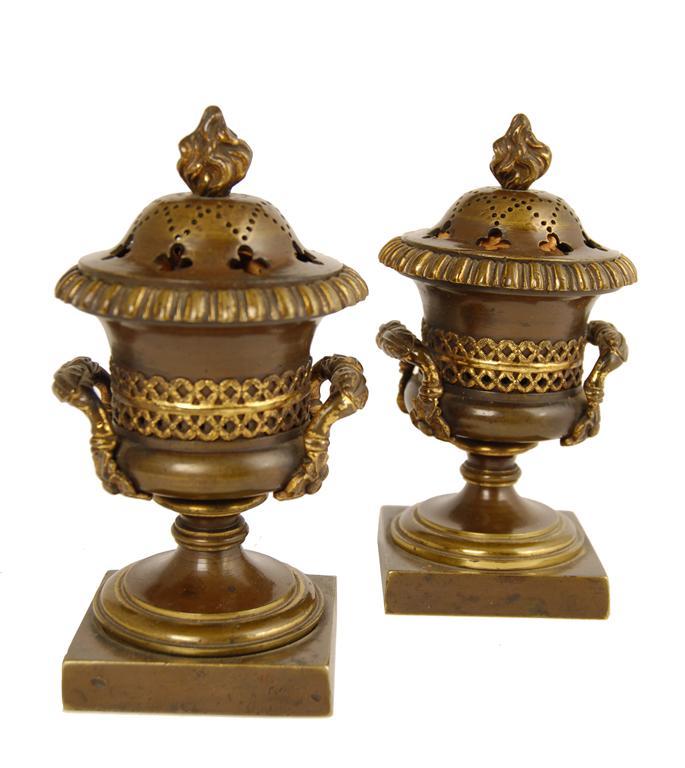 A pair of late 19th century parcel gilt bronze perfume burners, of campana urn shape with pierced covers having flame finials, 5.5in (14cm) h. (2)