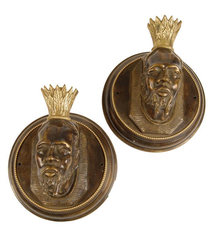 A pair of bronzed wall lights, modelled as a bearded mask with plumed light fitting surmount, 11.75in (30cm) dia, modern. (2)