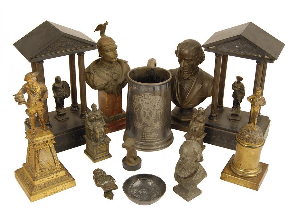 A gilt brass figure of Oliver Cromwell, standing on a tapering pedestal, inscribed, 10.25in (26cm) h, three metal busts, two figures of seated saints, a gilt brass figure standing on a domed column, a pair of figures in colonnaded temples, a torso, a pewter dish and mug. (13)