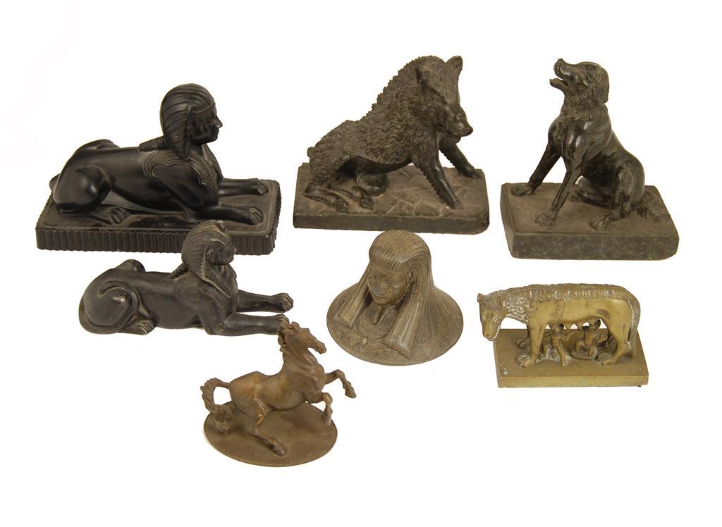 A model of the Florentine Boar, 6in (15cm) h, a model of a seated hound after the Molossain hound, a brass model of the Capitoline Wolf, a rearing horse, two models of sphinx and a pharoah head cover. (7)