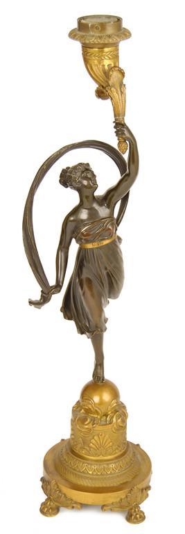 A parcel gilt bronze figural table lamp, modelled as Fortune, the sconce filled and previously with a shade, 21in (53.5cm) h.