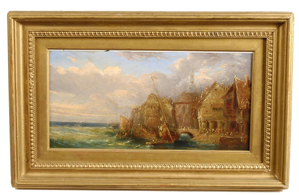 An oil on panel, continental port scene, 7 x 14in (18 x 35.5cm).