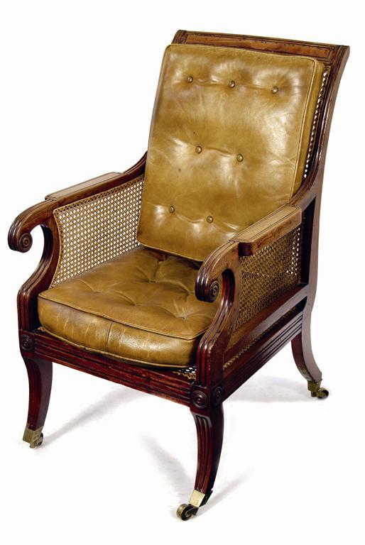 A George IV mahogany bergere, the moulded frame with a panelled top rail with caned back sides and seat having scroll arms and supports on sabre legs with brass castors, later buttoned leather squab cushions.