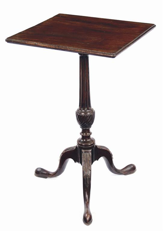 A mahogany tripod table, the associated rectangular top on a fluted stem to a spiral twist bowl on leaf carved cabriole legs and pad feet, 18th century and later, 29.5in (75cm) h, 18.75in (47.7cm) w, 17.25in (44cm) d. Restored, cracks to stem and base.