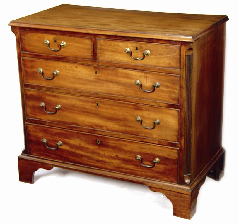 A George III mahogany chest, the moulded edge top above two short and three long graduated drawers flanked by fluted canted angles, on replaced bracket feet, 32.75in (82.9cm) h, 36.25in (92.2cm) w, 19.5in (49.6cm) d. Cracks to top and sides, restorations.