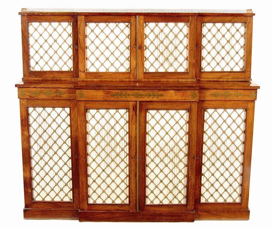 An early 19th century rosewood and brass marquetry breakfront chiffonier, in two parts, the top with a 3/4 brass gallery above gilt brass trellis doors, enclosing shelves and a plinth base, 53.75in (136.5cm) h, 59.5in (151.2cm) w, 15.5in (39.2cm) d. Veneer loss, locks replaces, hinges replaced to one door.