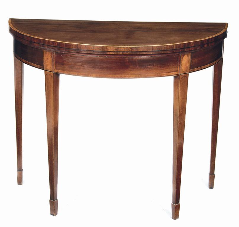 A late George III mahogany and rosewood banded demi-lune card table, on square tapering legs headed by oval satinwood panels, on spade feet, 29in (73.8cm) h, 36in (91.3cm) w, 17.75in (45.2cm) d. Restored.