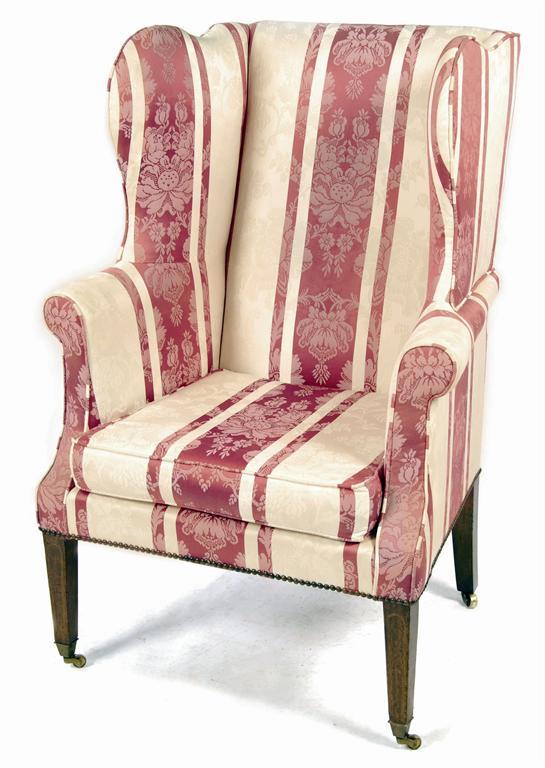 A wing armchair, upholstered in a striped brocade with loose cushion and brass studding on mahogany square tapering legs with stringing and brass castors, 19th century and later.