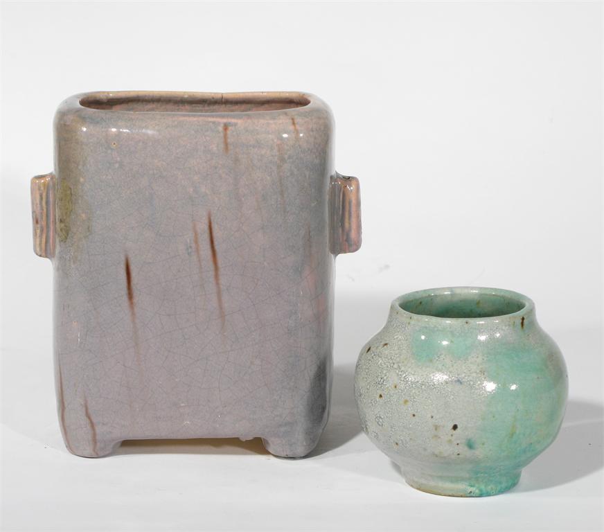 A Col'drum stoneware vase by Reginald Wells, rectangular section with applied lug handles, covered in a lavender glaze, and an ovoid vase covered in a green and lavender high-fired glaze impressed marks, minor firing faults, glaze loss to one foot 15.5cm. high