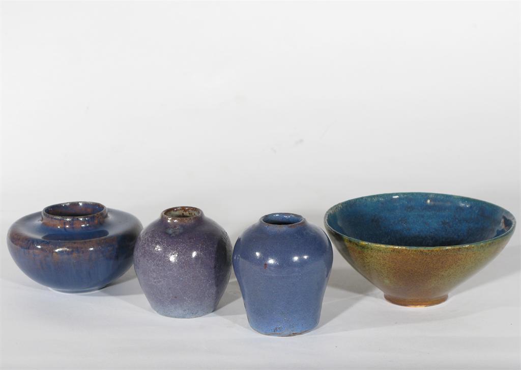 Three Mortlake Pottery miniature vases by George Cox, and a bowl, each glazed in shades of lavender and purple, incised marks to three, dated 1912-1913 tallest 6.5cm. high