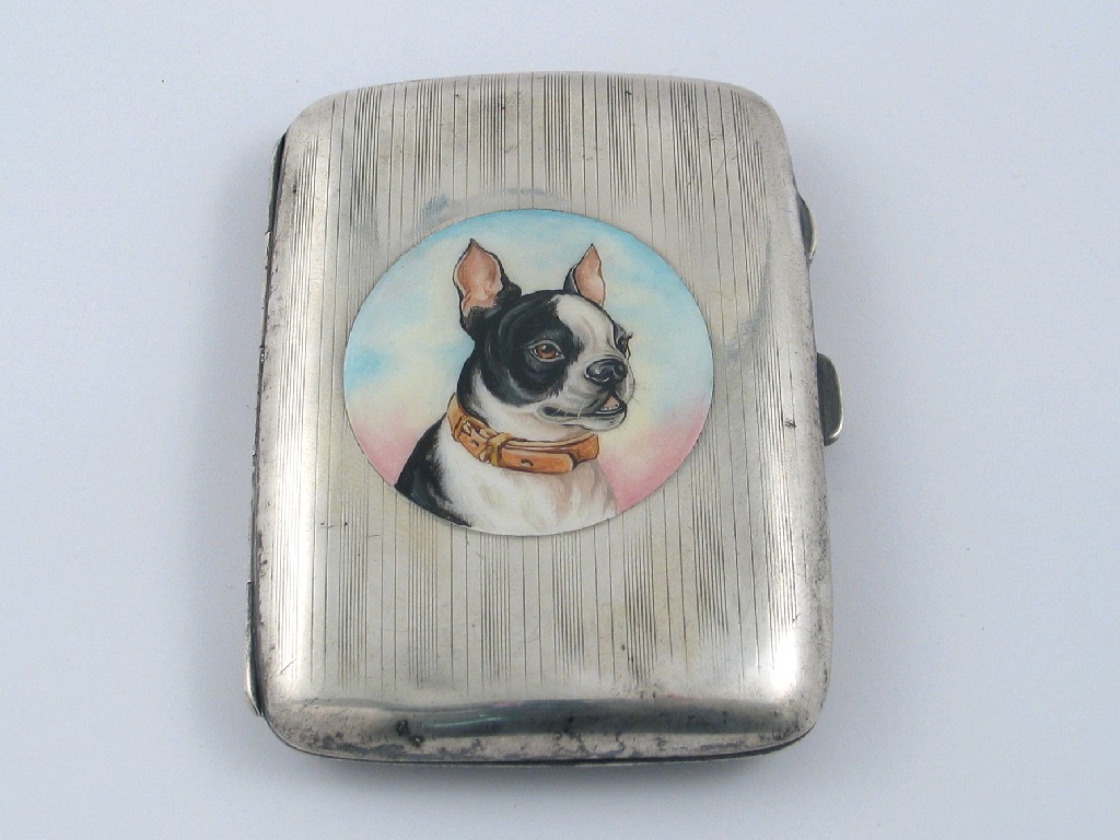 A modern engine turned cigarette case, enamelled in the centre with the circular portrait of a Boston terrier, by J. Gloster Ltd, Birmingham 1922, 3.5in (9cm) high, 2.5oz.