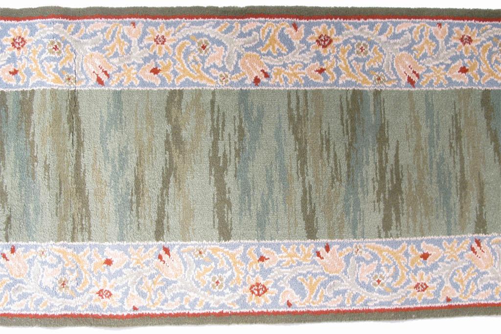 Two lengths of carpet designed by William Morris decorated with a border of scrolling flowers, and streaked green ground 60 x 580cm and 60 x 440cm. Literature Malcolm Haslam Arts and Crafts Carpets David Black, page 50 and 52-53 for this design illustrated on a Hammersmith carpet