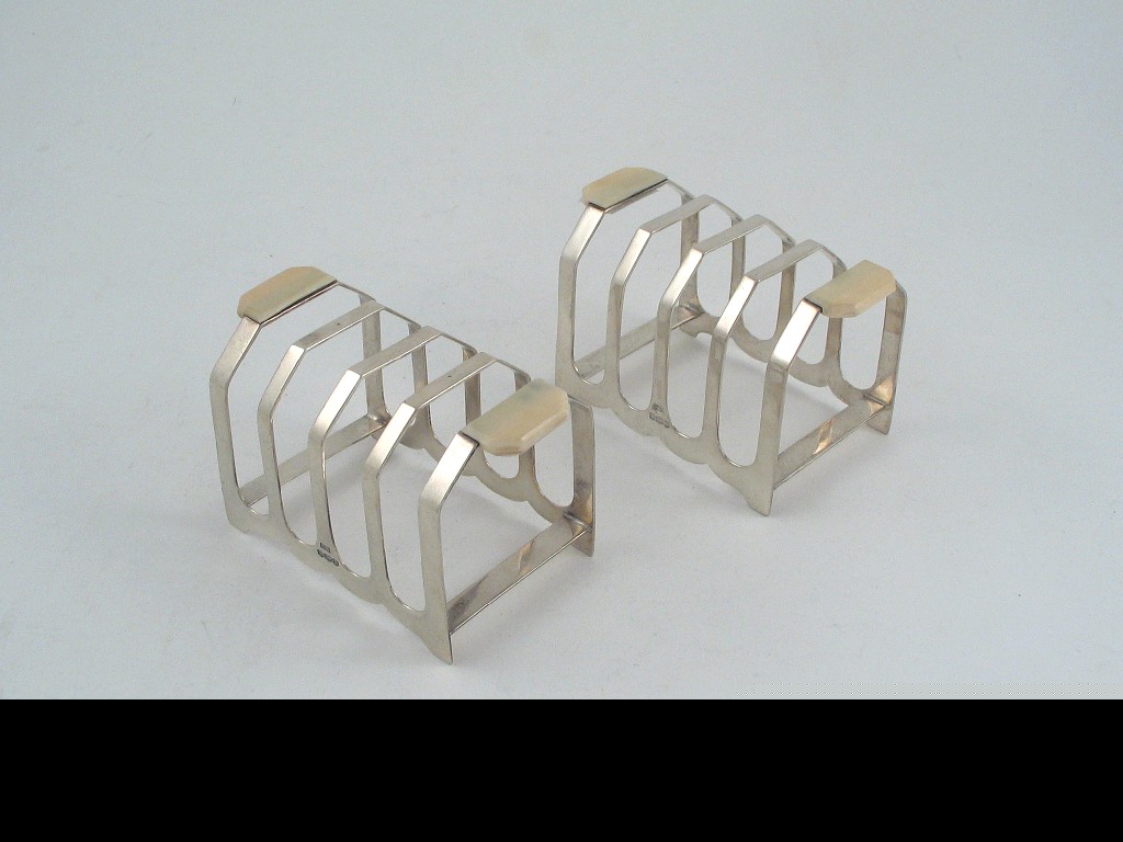 A pair of Art Deco ivory mounted five bar toastracks, maker's mark E.V. Sheffield 1940, 4.4in (11cm) wide, 6.5oz.