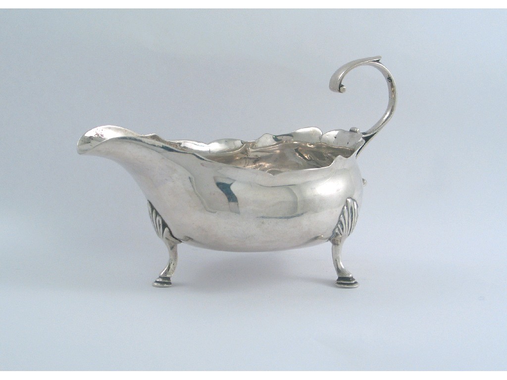 A George III North Country provincial sauceboat on three feet with a wavy rim and flying scroll...