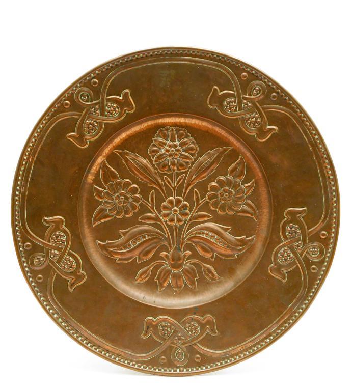 A James Smithies, Wilmslow hammered copper charger the well with stylised flower spray, the rim a frieze of Celtic knot stamped marks 48cm. diam.