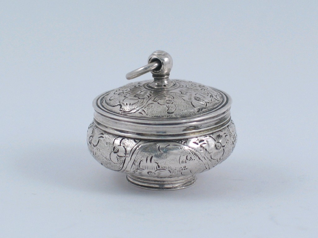An 18th century continental pomander, in the form of a small pot with a screw cover, screw off base and a ring finial, the exterior with chased decoration, the interior with removable grille, unmarked, probably German, second half of the 18th century, 1.25in (3.3cm).
