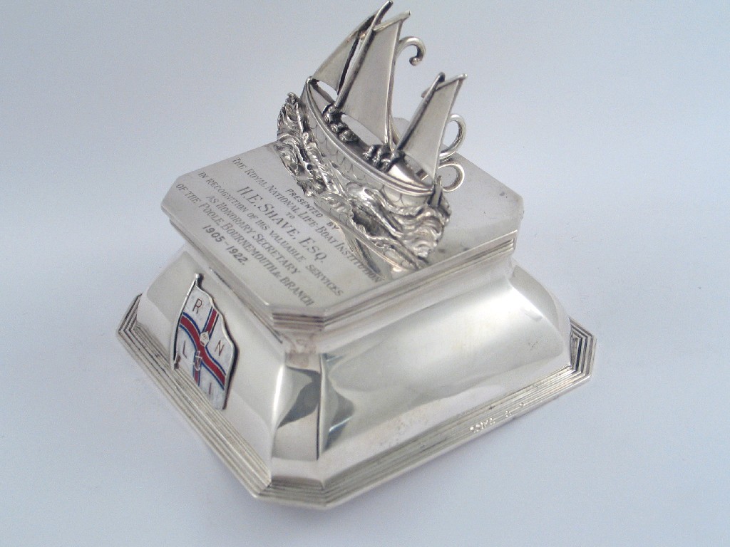 A modern square inkwell with canted corners and a cast lifeboat, under sail on the cover, inscribed "Presented by the Royal National Lifeboat Institution to H.E. Shave Esq in recognition of his valuable services as honorary secretary of the Poole & Bournemouth branch 1905-1922", the front with the applied enamel badge of the R.N.L.I, by the Grinsell, Brimingham 1921, 4.25in (10.7cm) square (glass-inset base).