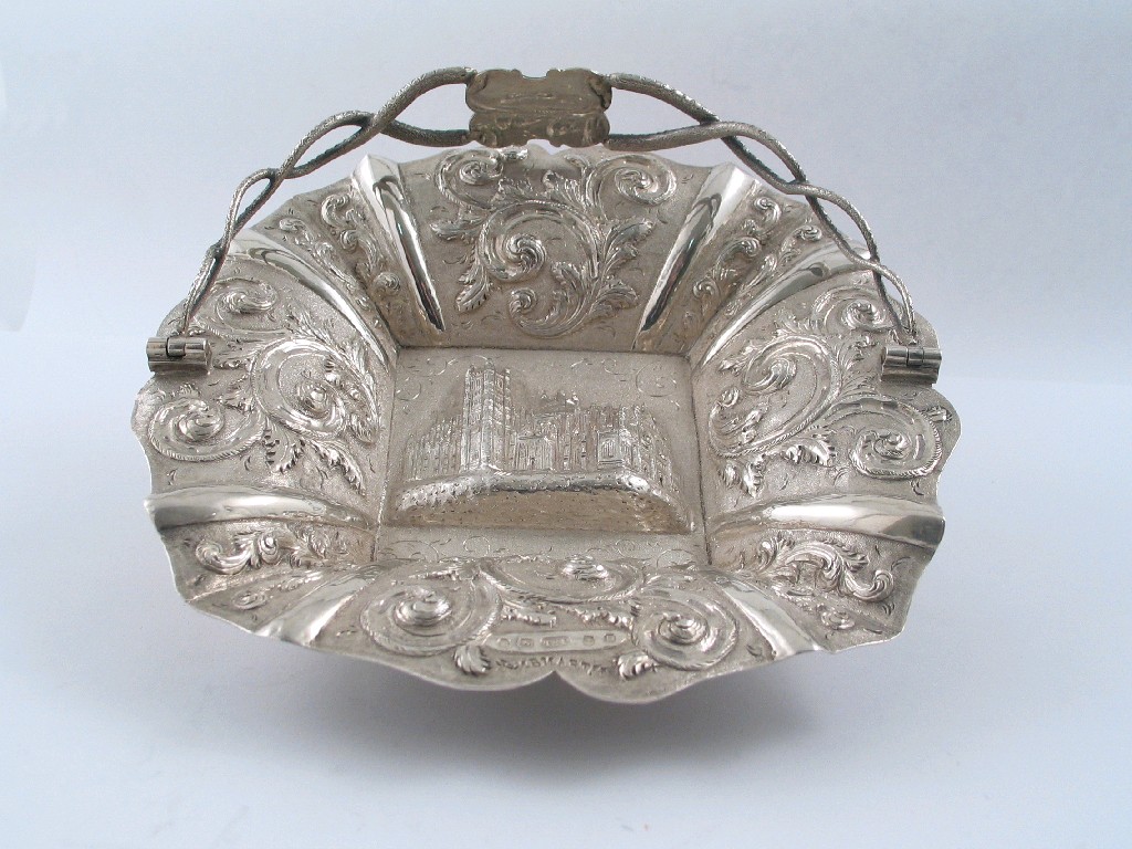 Devon Interest: a Victorian swing handled 'Castletop' bon bon dish decorated in high relief in the centre with a view of Exeter Cathedral bordered by foliate scrolls on a matt ground, by Taylor & Perry Birmingham 1847 and stamped "COMBMARTIN" * 5.2in (13cm) diameter, 4oz.