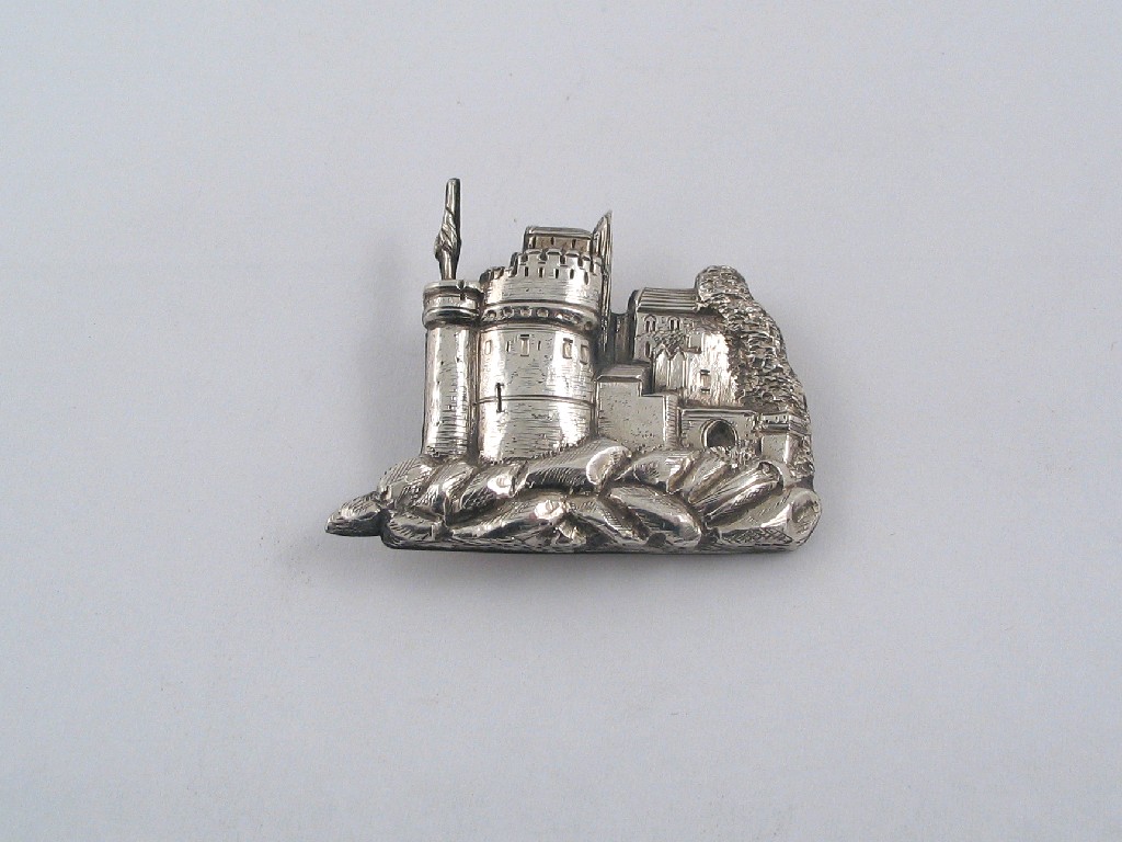 Devon Interest: a Victorian brooch in the form of Dartmouth Castle in high relief, stamped "Reg Oct 21.1847, H.S. Ellis Exeter" and "COMBMARTIN SILVER" * by H. Ellis, Exeter 1847, 1.6in (4cm) wide, 0.3oz.
