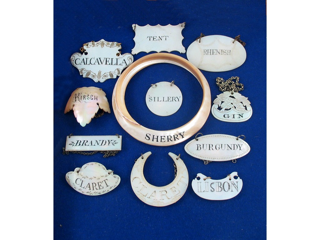 A group of twelve assorted late 18th/19th century mother of pearl wine labels: "CALCAVELLA", "TENT", "RHENISH", "KIRSCH", "SHERRY", "SILLERY", "GIN", "BRANDY", "BURGUNDY", "CLARET", "CLARET" & "LISBON". (12)