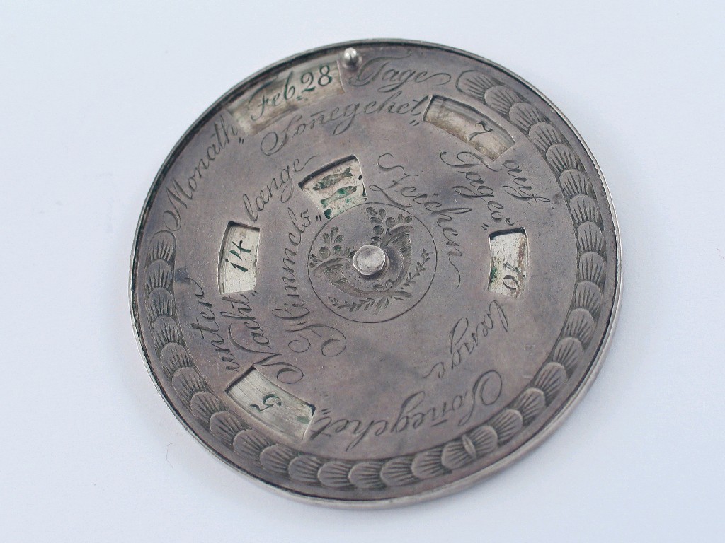 An 18th century German perpetual calendar of disc form with the days and date on one side and...