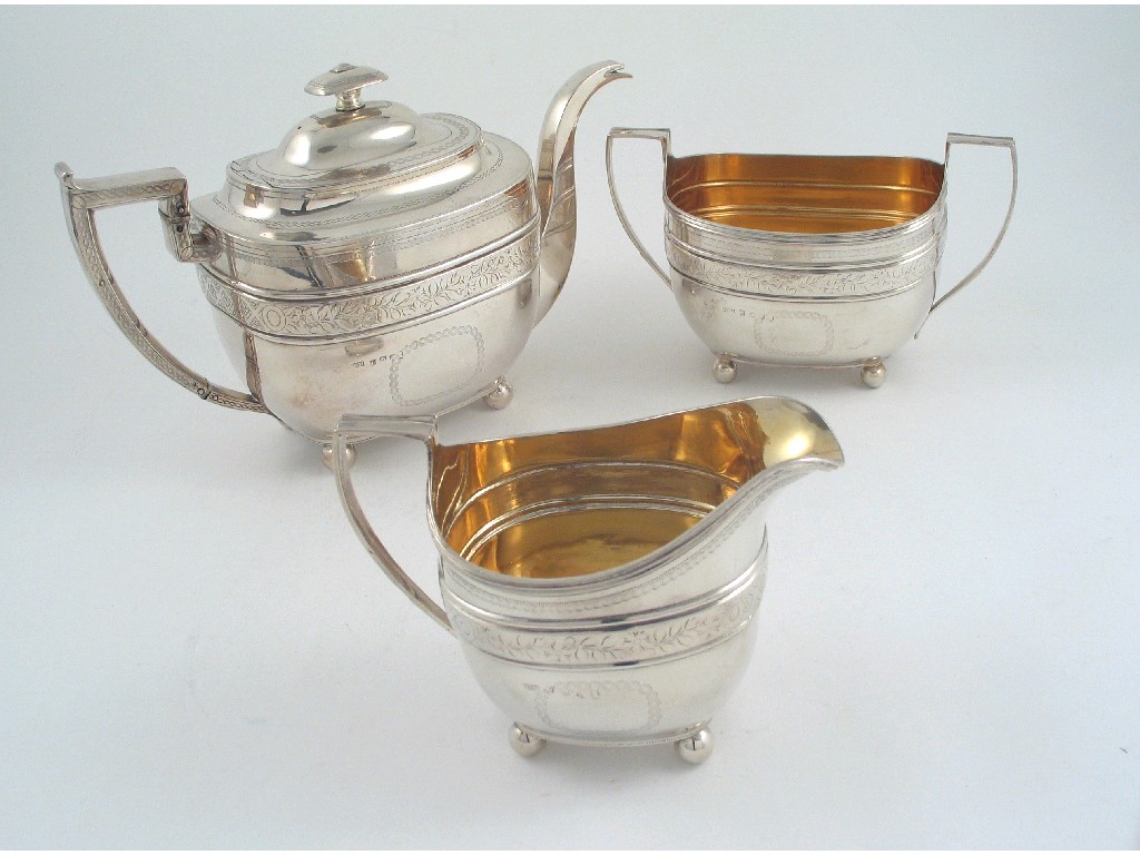 A George III Scottish barge shaped three piece teaset, with engraved bands of decoration and vacant oblong cartouches, gilt interiors on ball feet, by Dick & McPherson, Edinburgh 1808, 10.5in (27cm) max width, 36oz. (3)