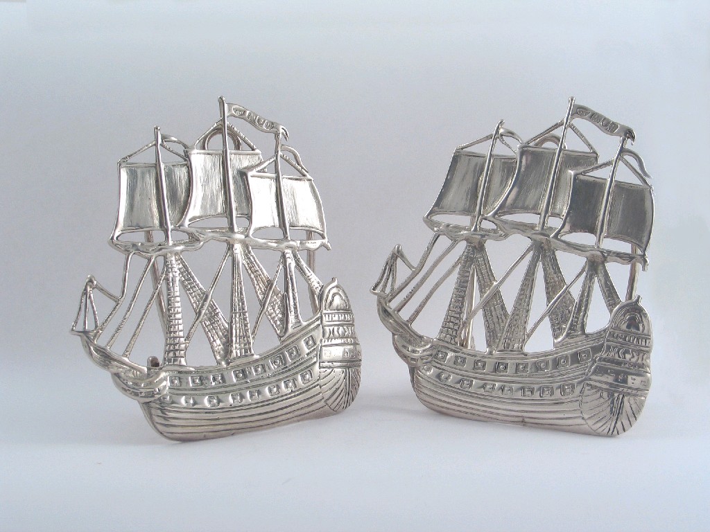 A pair of late Victorian stands, in the form of a three masted wooden sailing ship, with sprung clips, for large menu's or letters, maker's mark 'JD', London 1897, 5in (12.7cm) high, 13oz. (2)