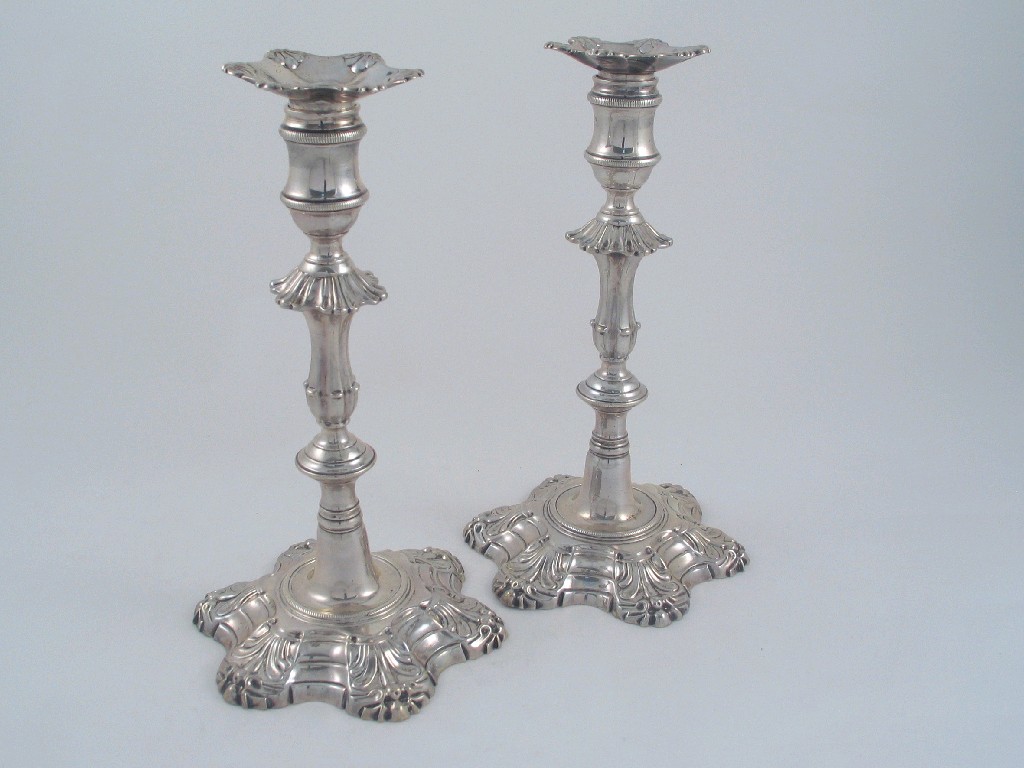 A pair of George II cast candlesticks on hexafoil bases with knopped baluster columns, shell decoration and ribbed mouldings, detachable nozzles, by William Cafe, London 1759, 9.5in (24cm) high, 38.5oz.