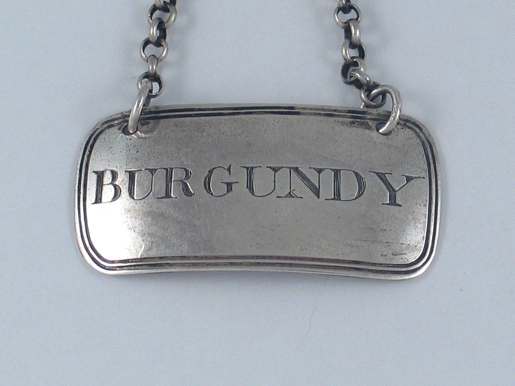 A Victorian wine label, of rounded oblong form, reeded border and incised 'BURGUNDY', maker's mark CS, London 1849.