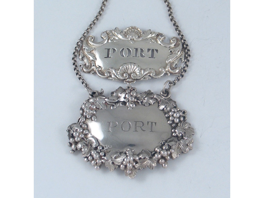 A George IV cartouche wine label, with a border of shells and leafy foliage, pierced 'PORT', by Charles Reily & Paul Storer, London 1829, together with another wine label with a stamped fruiting vine border incised 'PORT', by Elkington & Co, Birmingham 1849. (2)