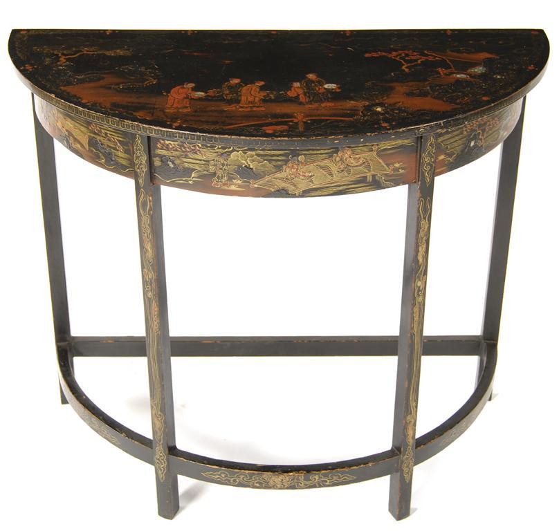 A black lacquer demi-lune side table, inlaid mother of pearl and decorated with chinoiserie, early 20th century, 30in (76.3cm) h, 35.75in (90.8cm) w, 18in (45.7cm) d.