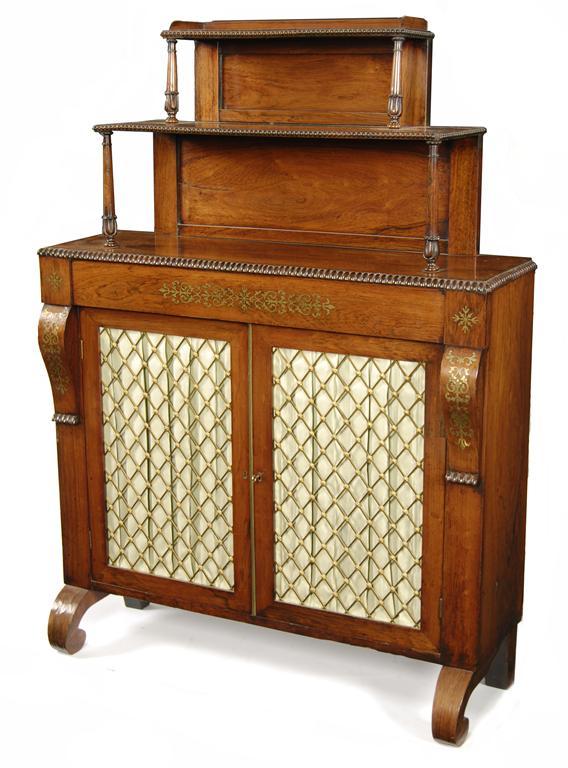 A George IV rosewood and brass inlaid chiffonier, the stepped superstructure with bead edges and leaf carved and turned supports, the base with a pair of fabric backed brass grille doors enclosing two shelves, backed by scroll volutes on conforming legs, early 19th century and later, 53.5in (136cm) h, 39in (99cm) w, 14in (35.5cm) d.