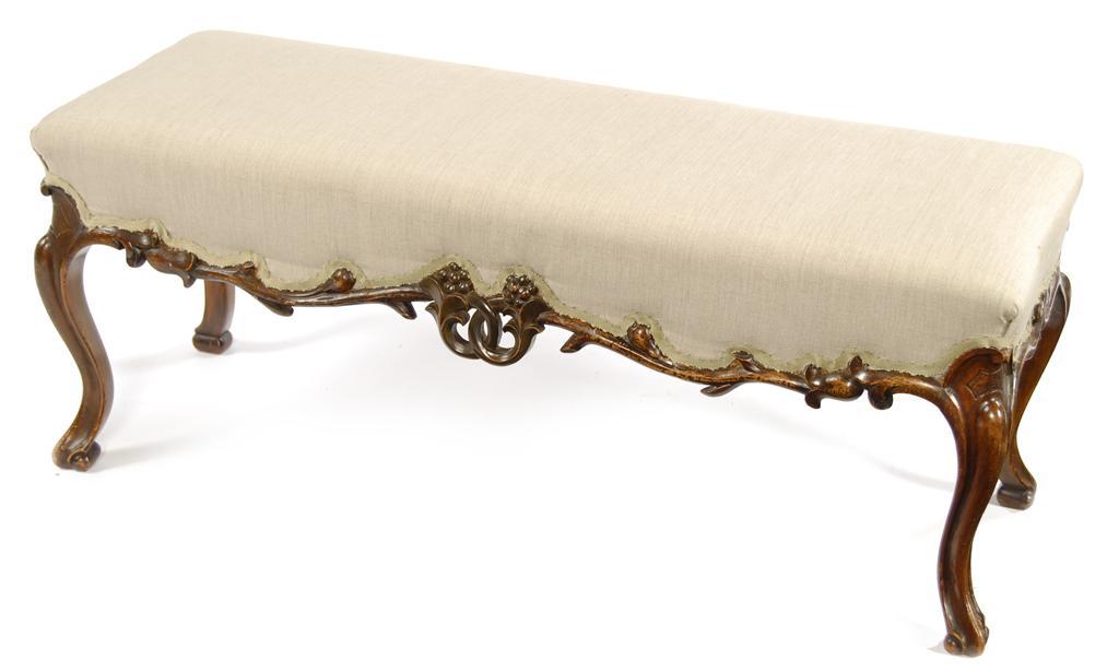 A Victorian carved walnut long stool, the upholstered seat above a naturalistic carved frieze on cabriole legs and scroll feet, 16in (40.8cm) h, 41in (104cm) w, 15in (38cm) d. Old damages restorations and replacements.