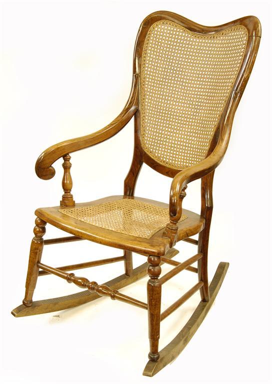A simulated rosewood rocking chair, with a cane back and seat.