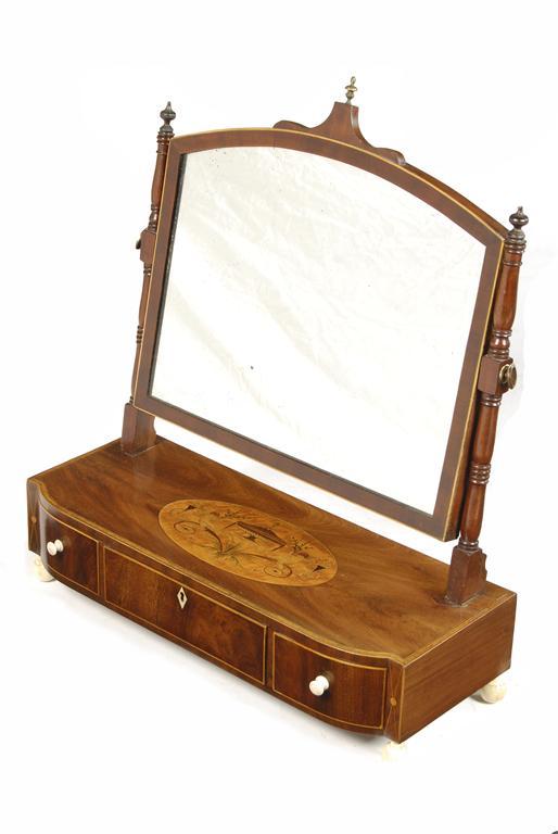 An early 19th century mahogany and marquetry dressing table mirror, the arched plate to ring turned baluster supports, the barrel front base inlaid a satinwood urn and cherubs, above three drawers on turned ivory feet, 25.75in (65.2cm) h, 28in (58.2cm) w, 9.5in (24.2cm) d. Restoration, handles replaced.
