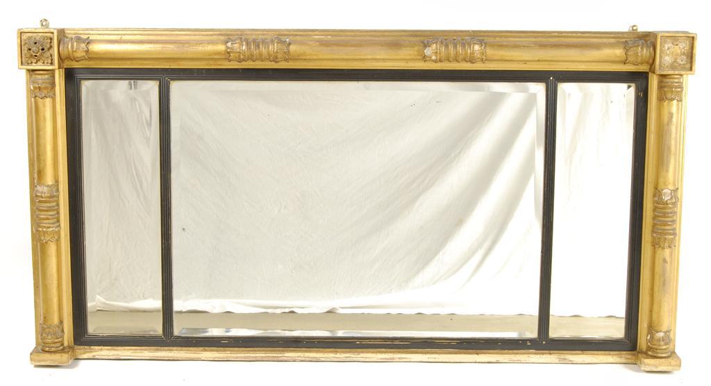 A Victorian giltwood overmantel mirror, the triple bevelled plates to an ebonised slip and baton carved frame, 27.25 x 54.5in (70.3 x 138.3cm). Losses to frame.