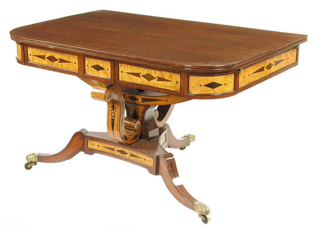 An early 19th century mahogany and bird's eye maple veneered table, the hinged revolving top with rounded corners above a panelled frieze inlaid geometric motifs, on a arched and twin scroll supported base centred a ball finial, the triform base with hipped scroll legs on brass paw sabots and castors, 30.5in (77.5cm) h, 54in (137cm) w, 35in (89cm) d, closed.