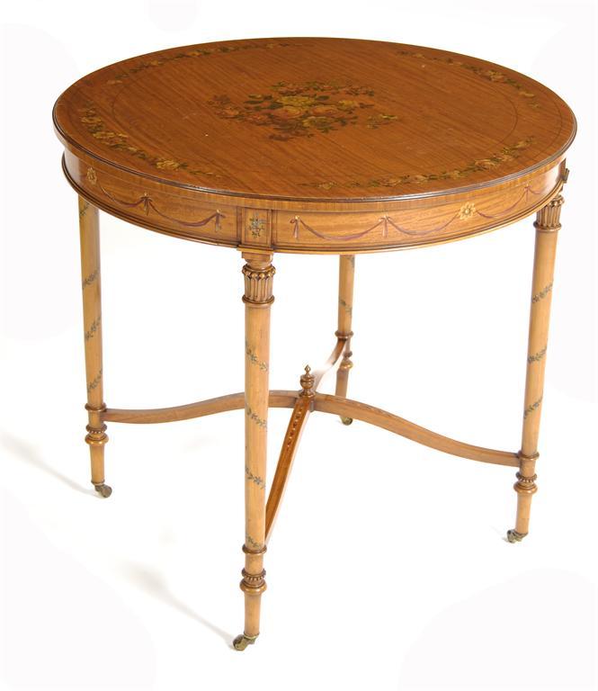 A late Victorian 'Sheraton Revival' circular table, painted with floral sprays and swags, on carved column supports united by an 'X' stretcher, to brass castors, 28.25in (71.5cm) h, 30in (76cm) dia. Old damage and repairs to legs.