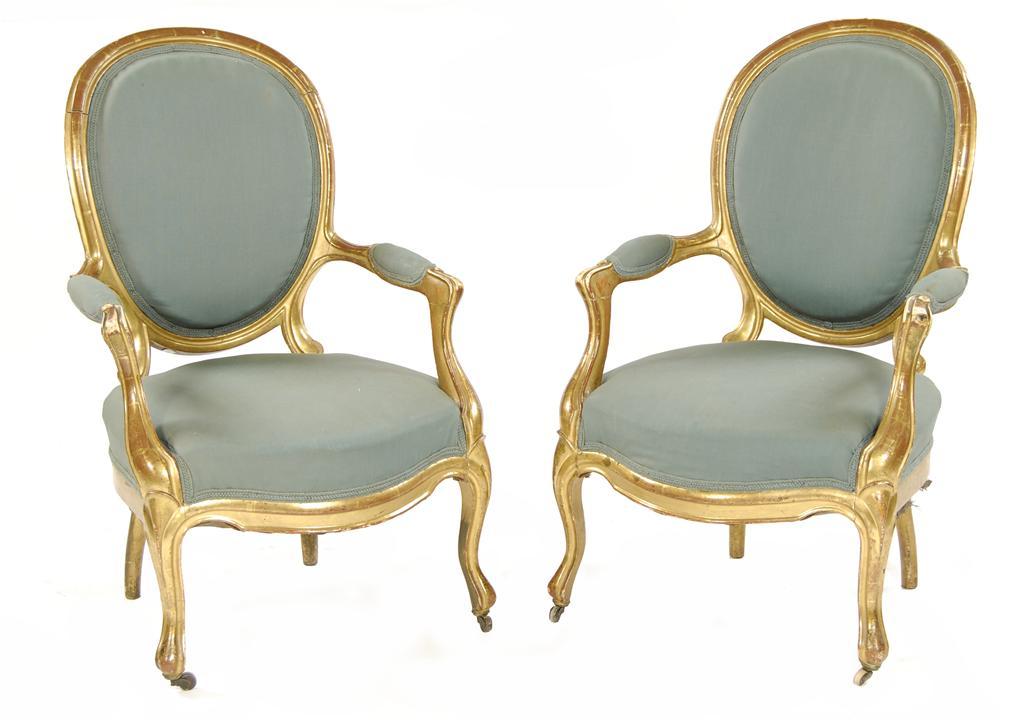 A pair of French giltwood fauteuil, with oval padded backs, padded arms and stuffed over serpentine front seats, the cabriole legs with horn castors, the backs previously with cresting's, mid 19th century. (2) Old damages.