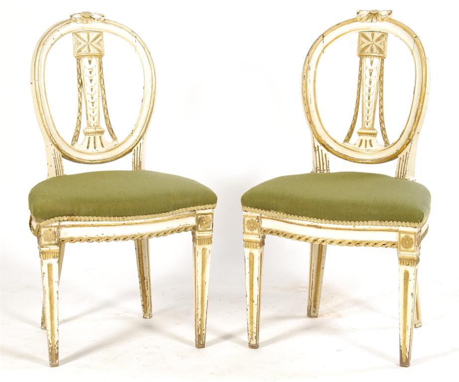 A pair of early 19th century carved wood and painted side chairs, the oval ribbon-tied backs with a tapering splat to later stuffed over seats, one still caned, on square tapering legs. (2) One with wormed back leg.