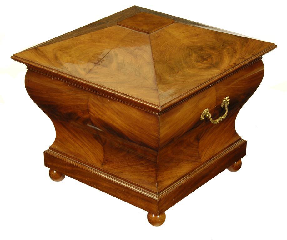 An early Victorian mahogany cellaret, of waisted sarcophagus form, the vacant interior to foliate cast brass swing handles on ball feet, 19.75in (50cm) h, 21in (53.3cm) w and d.