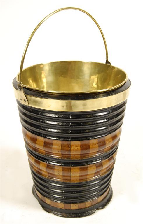 A Dutch ebonised, mahogany and fruitwood bucket, with a brass swing handle and lift-out liner, 14.25in (36cm) h, 12in (30.5cm) dia.