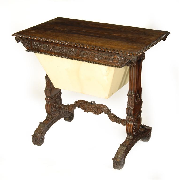 An Anglo-Indian carved macassar ebony work table, the hinged top revealing a compartmented interior to a leaf and paterae carved frieze, above a bag, on lyre shape trestle ends united by a shaped stretcher, 19th cenutry, 29.5in (75cm) h, 32.25in (81.7cm) w, 20.5in (52cm) d.